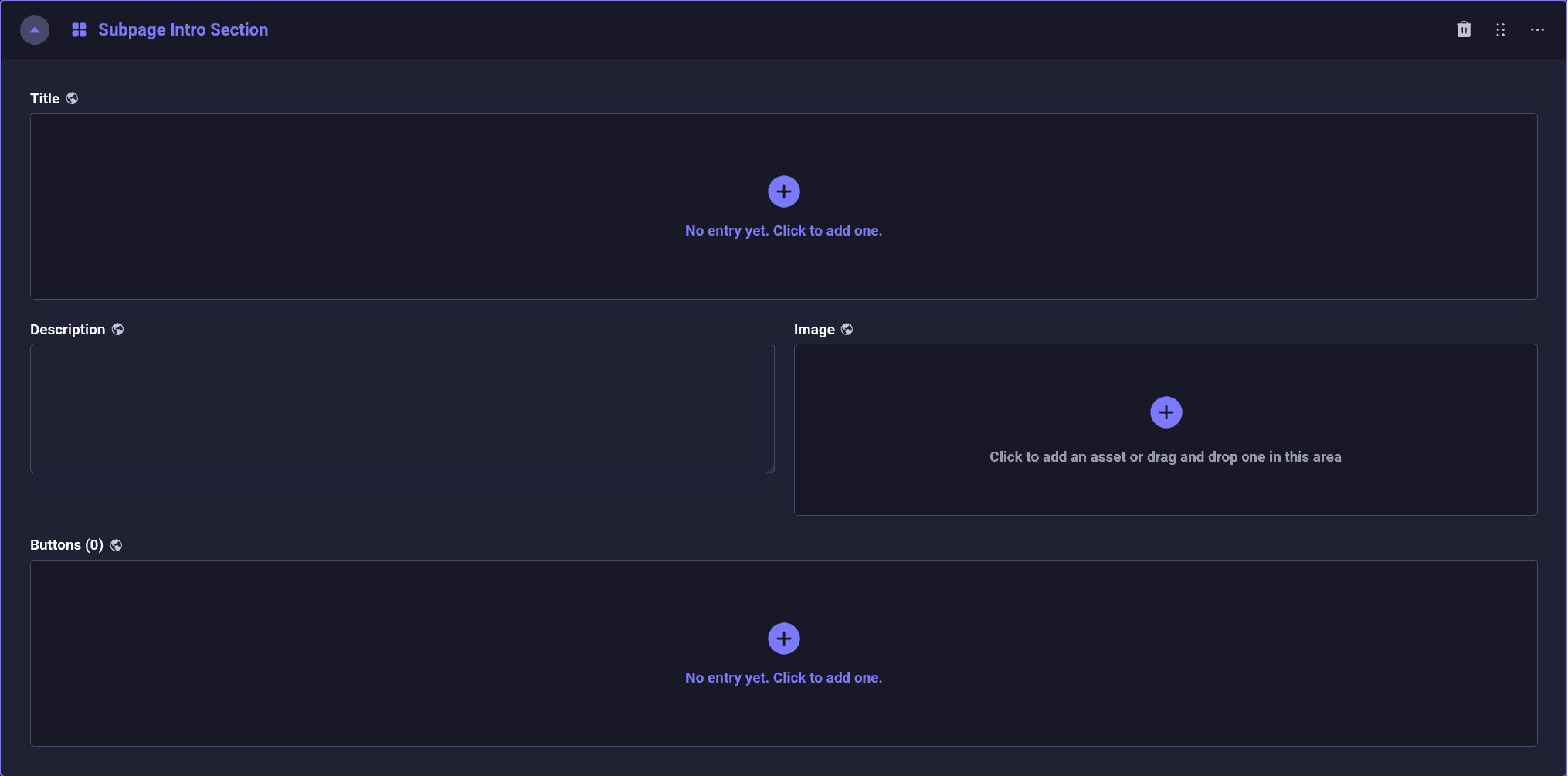 Die „Subpage Intro Section“ dient als einleitendes Inhaltselement auf vielen Landingpages, um einen einheitlichen Look zu erzeugen. Es gibt ein Bild als Hingucker, eine Überschrift (immer h1) und Buttons.
