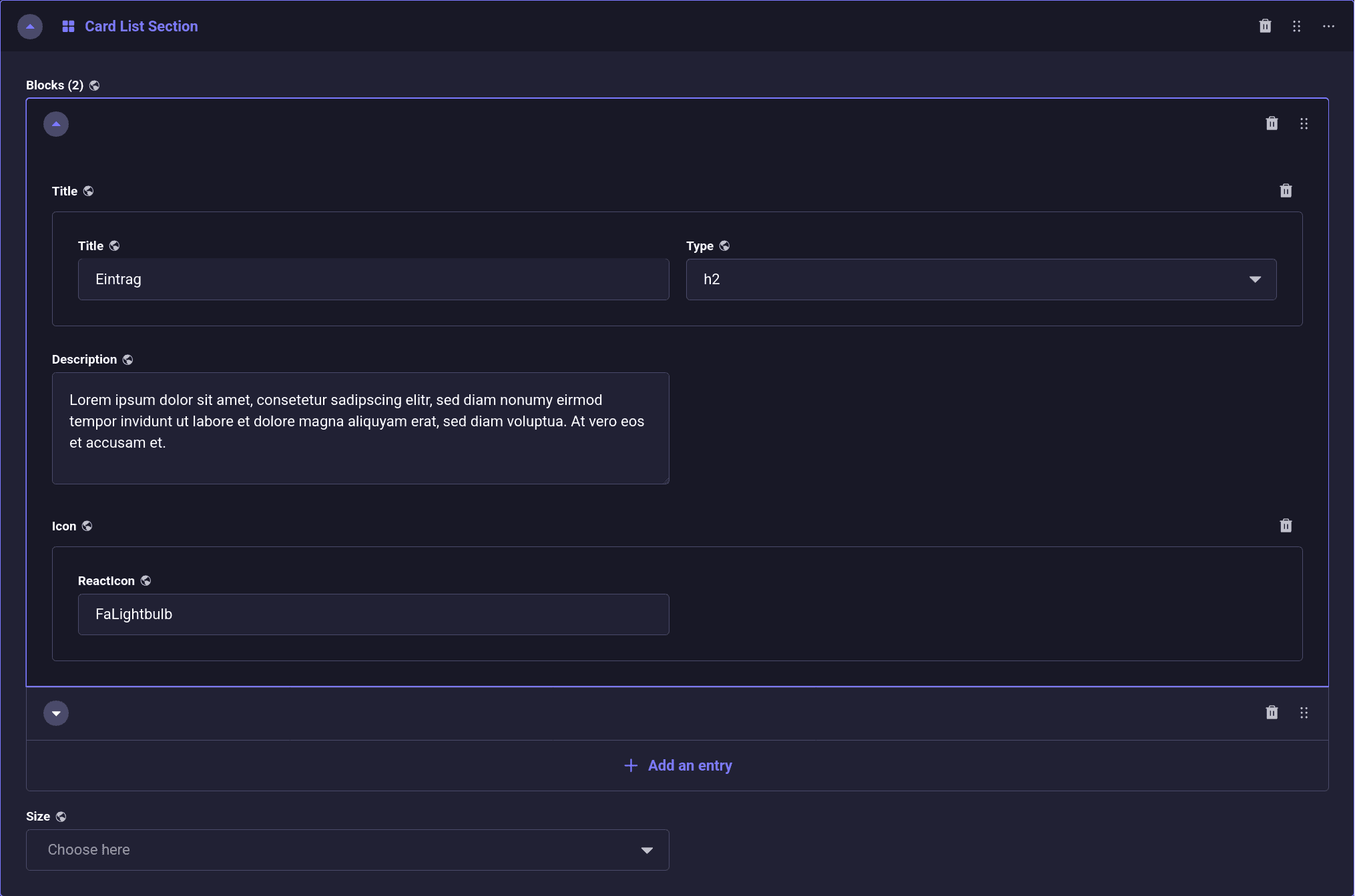 Die „Card List Section“ fügt einfache Karten/Kacheln mit einer Überschrift und einem Text in einer horizontalen Liste zusammen. Mehrere dieser Sections übereinander angewandt erzeugen eine Mauerwerk-Optik.
