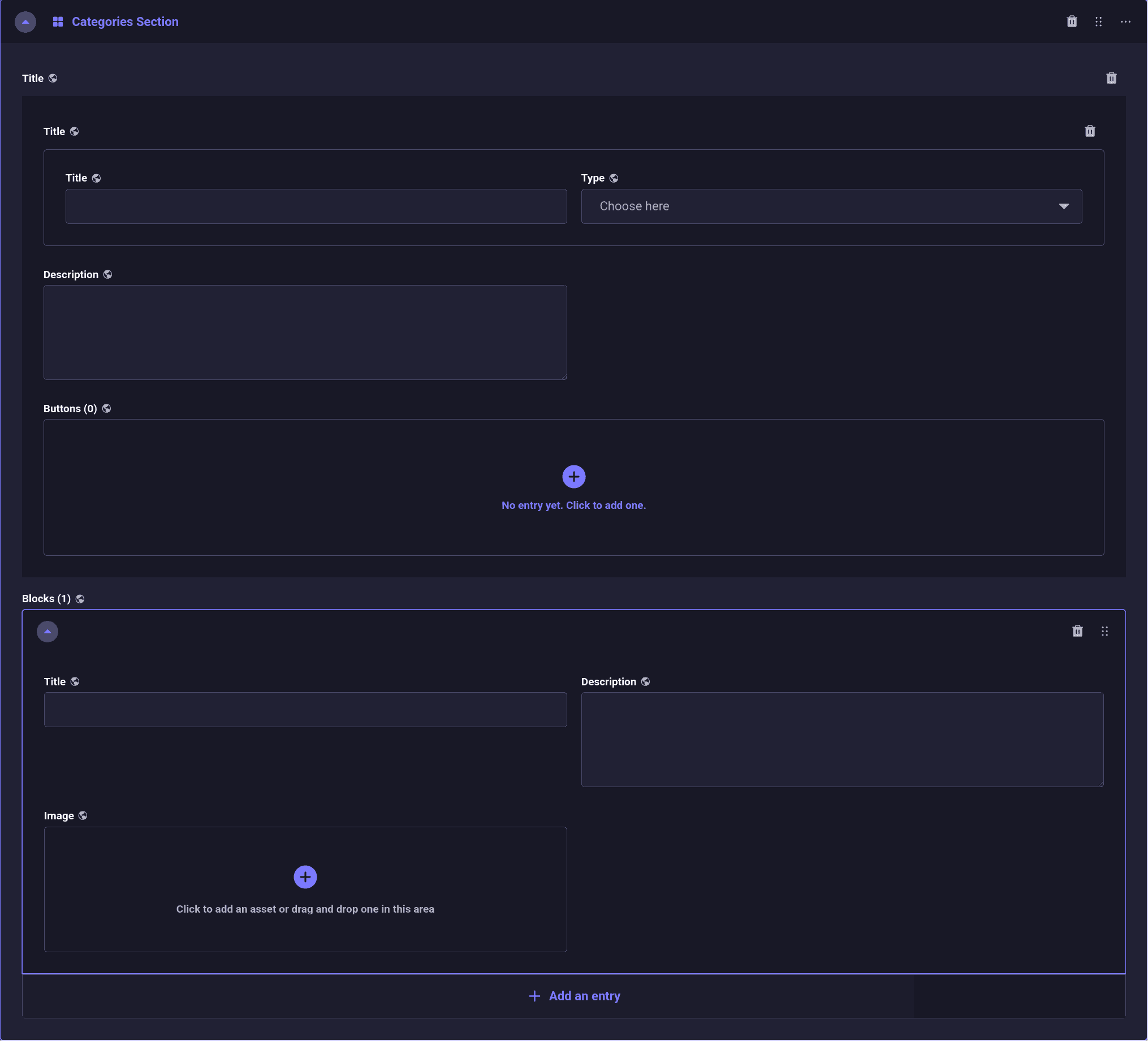 Dieses Inhaltselement ist eines unserer komplexesten, da es groß und vollständig designt ist. Es besteht aus einem Kopfbereich mit Überschrift, Beschreibung und Buttons gefolgt von einem Blocks-Bereich, in dem beliebig viele Kategorien mit Bild, Titel und Text verlinkt werden können. Das Inhaltselement bietet sich vor allem auf der obersten Menüebene an, da ein Nutzer hier einen direkten Überblick über die hinterlegten Angebote erhält.