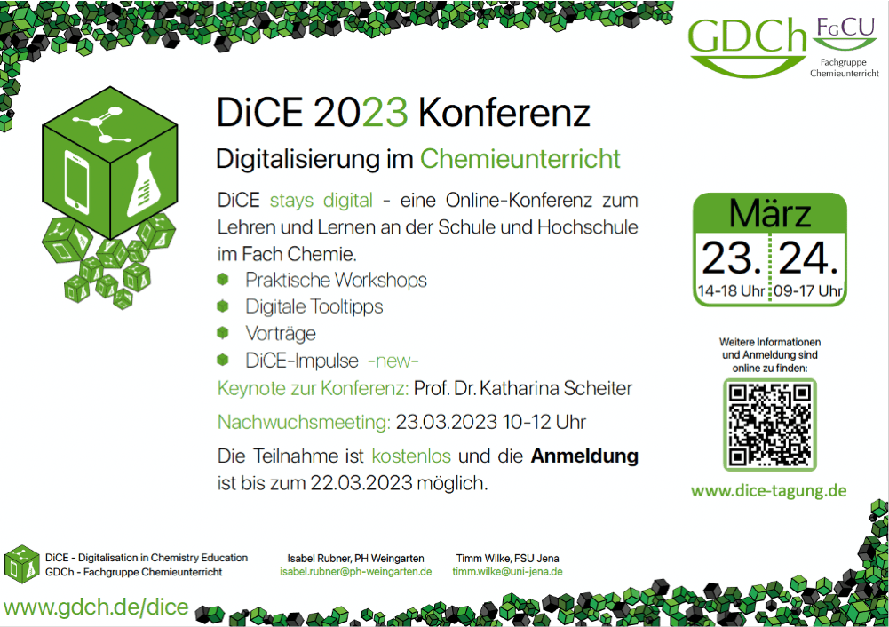 Die Digitalisierung bewegt aktuell nicht nur Deutschland, sondern ist eines der wichtigsten Themen des 21. Jahrhunderts weltweit. Um die Sichtbarkeit der AG im internationalen Umfeld zu gewährleisten, haben wir uns daher für den Englisch sprachigen Namen "Digitalisation in Chemistry Education" entschieden. Da sich aus den vier Anfangsbuchstaben das Akronym dice (Engl. für Würfel) bilden lässt, war damit auch unser Logo geboren :-)