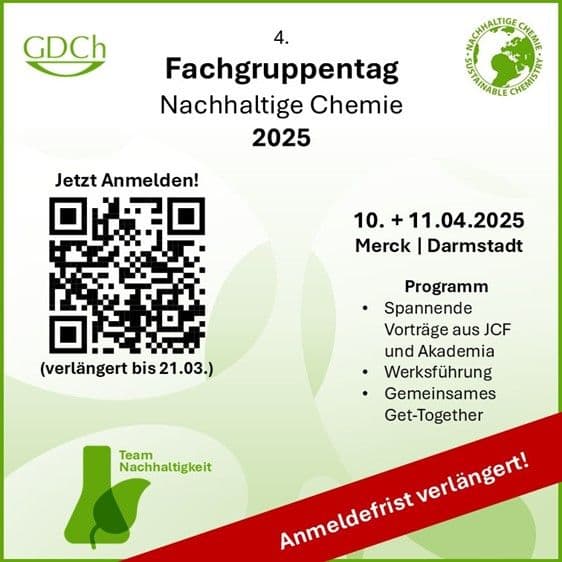 Deine Forschung in Promotion, Bachelor- oder Masterarbeit richtet sich an nachhaltige Themen oder grüne Aspekte der Chemie und Du möchtest diese gerne vorstellen? Dann gibt es die Option, den Fachgruppentag mit einem Vortrag (à 15 min + 5 min Diskussionsrunde, Vortragssprache: Deutsch / optional englisch) zu bereichern. Es stehen drei Vortrags-Slots zur Verfügung, die “first come, first serve” vergeben werden.