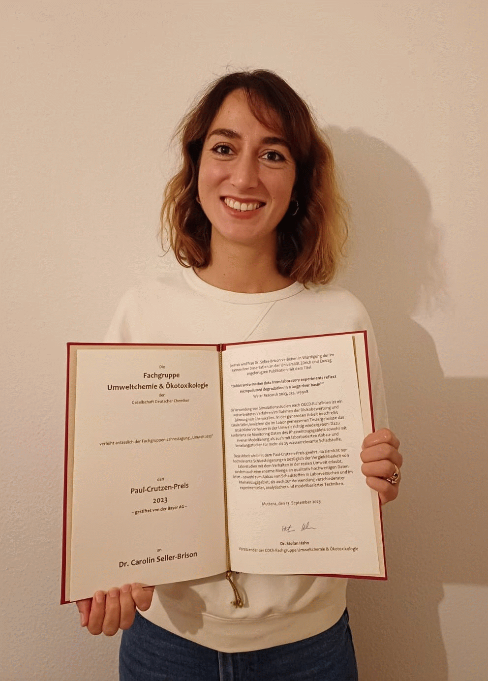 Der Paul-Crutzen-Preis - gestiftet von der Bayer AG - wurde 2023 geteilt und anlässlich der Fachgruppen-Jahrestagung „Umwelt 2023“ an Dr. Carolin Seller-Brison und Dr. Florian Ungeheuer verliehen.