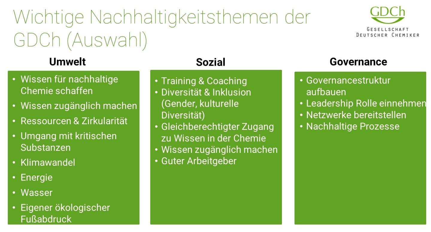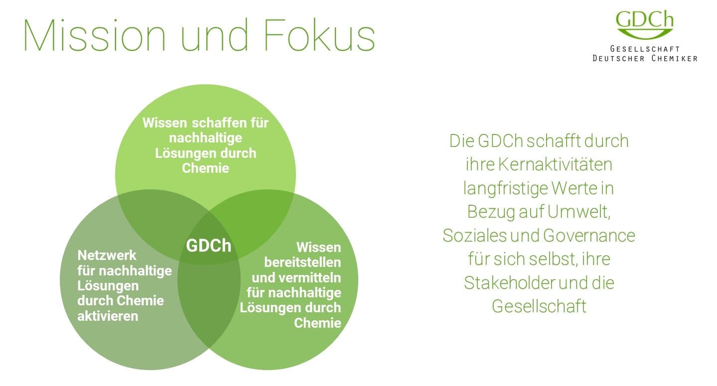 Aus diesem Grund freue ich mich, Ihnen heute unsere Nachhaltigkeitsstrategie vorzustellen. Nachhaltigkeit ist für uns nicht nur ein Schlagwort, sondern ein Leitprinzip, das wir in all unseren Aktivitäten verankern wollen. Ziel unserer Strategie ist es, Nachhaltigkeit in der GDCh in all unseren Prozessen zu verankern. Hierbei wollen wir basierend auf unseren Kompetenzen Informationen bereitstellen und so helfen, Lösungen zu schaffen und zum nachhaltigen Handeln in Wissenschaft, Wirtschaft und Politik beizutragen.