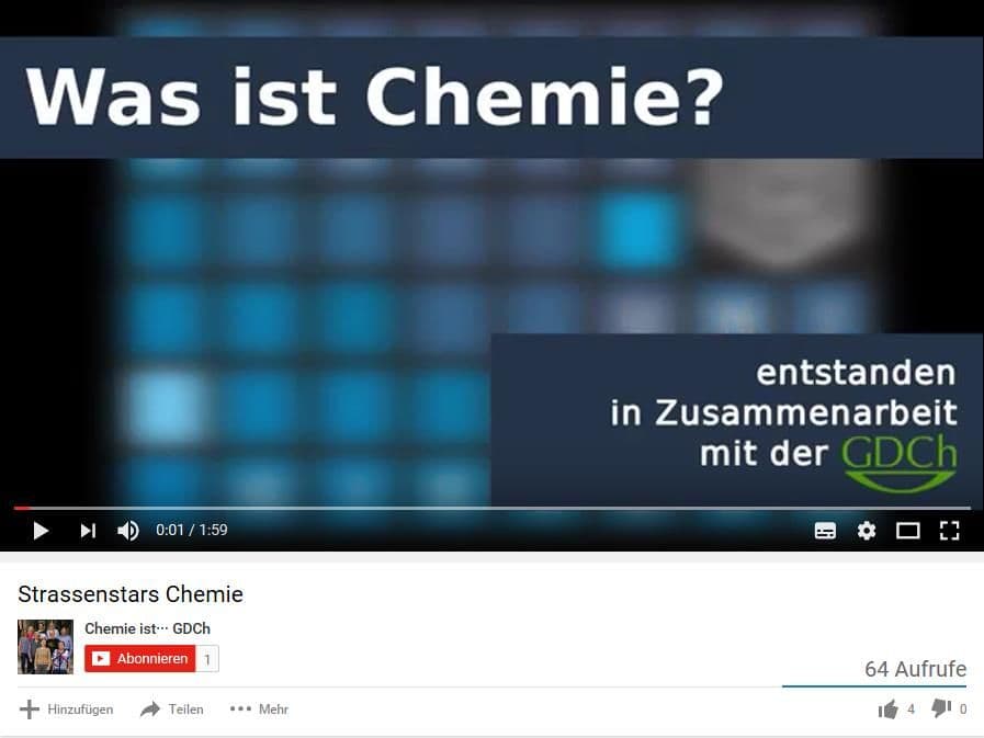 hat die Arbeitsgruppe „Chemie ist…“ der GDCh Passant*innen auf der Zeil in Frankfurt gefragt. Von "Äääähhhm“ über "jede Menge Zahlen und Formeln", "meine Leidenschaft", "gefährlich" bis hin zu "viel besser als Physik" lauteten die Antworten, aus denen die AG einen witzigen Film gemacht hat. Klicken Sie mal rein. Die Arbeitsgruppe "Chemie ist..." ist in der Arbeitsgemeinschaft Chemie & Gesellschaft tätig.